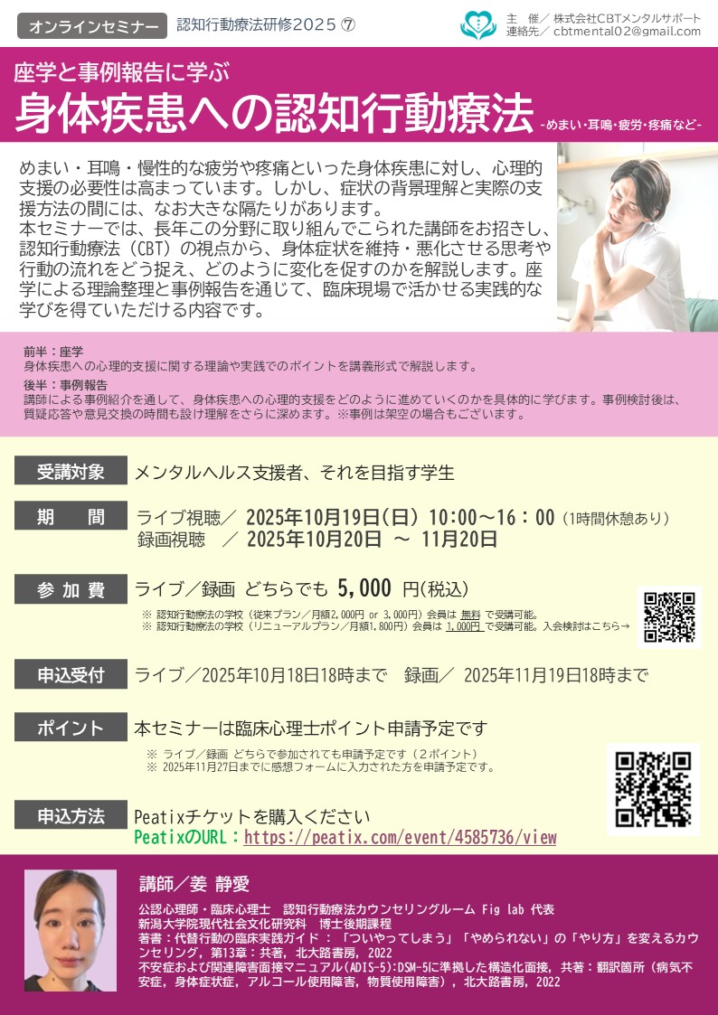 【認知行動療法研修2025⑦】座学と事例報告に学ぶ 身体疾患への認知行動療法 ‐めまい・耳鳴・疲労・疼痛など-